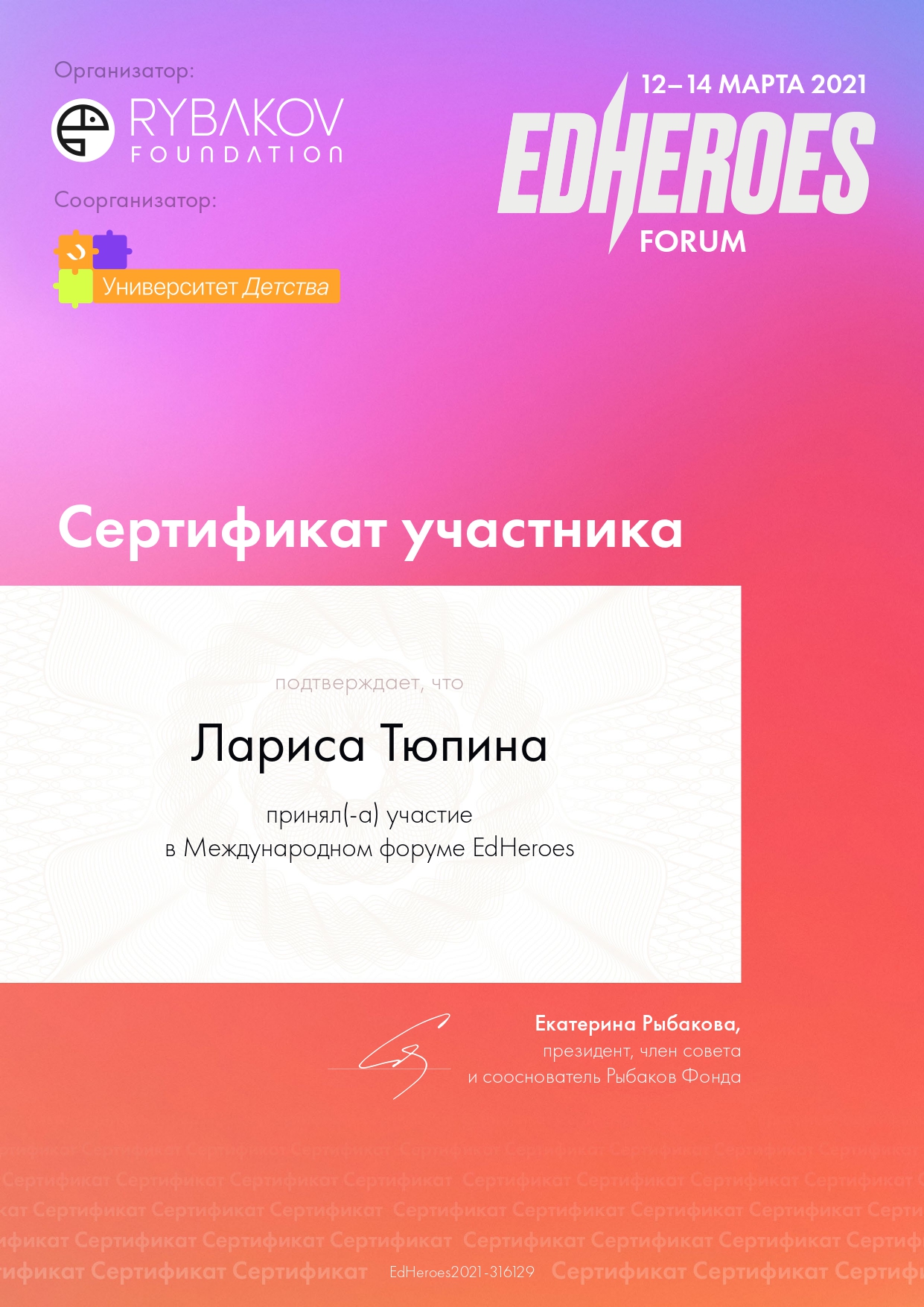 Сертификат участника в Международном форуме EdHeroes 12 - 14 марта 2021 г.