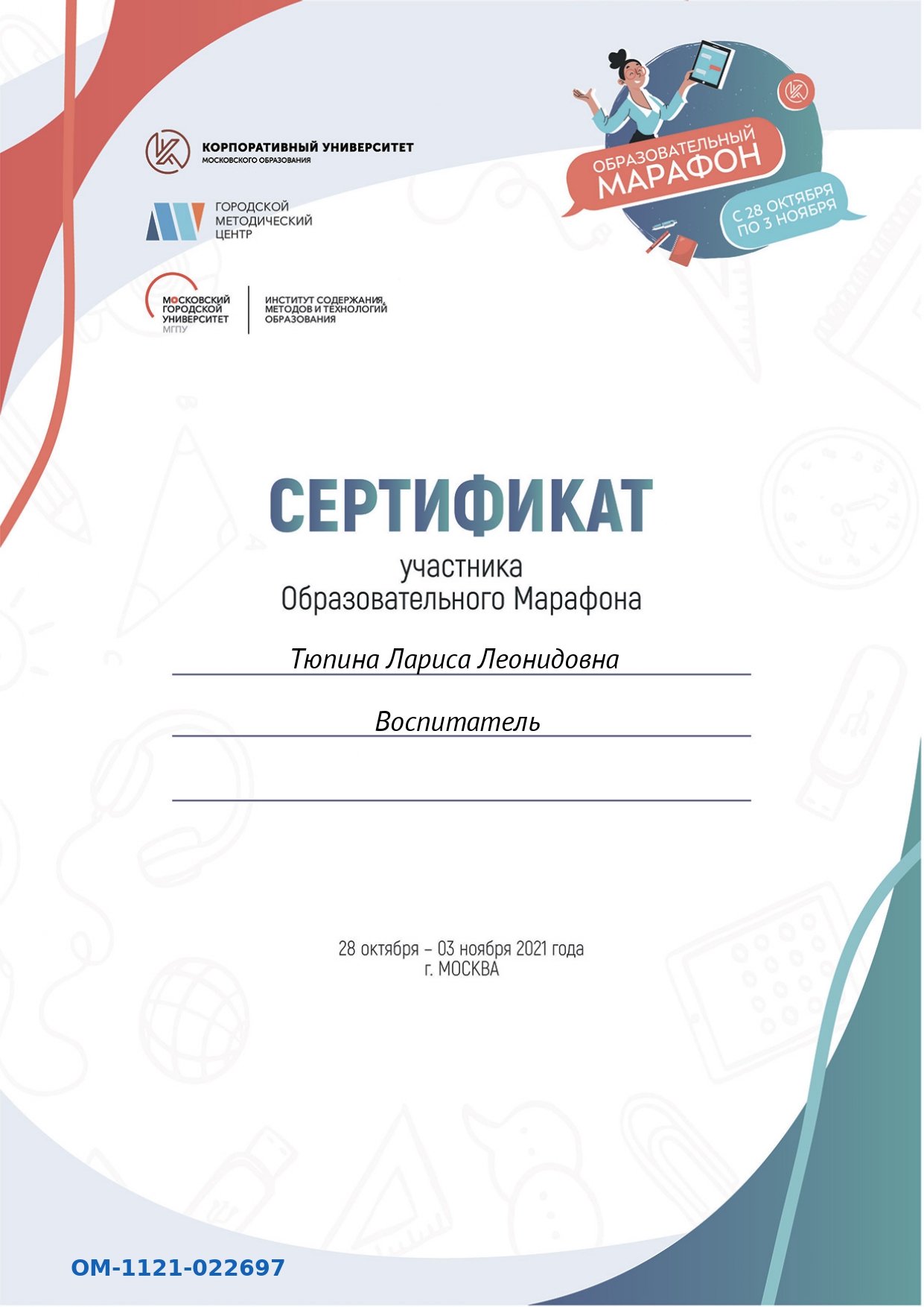 Сертификат участника Образовательного Марафона, 20 октября - 03 ноября 2021 г.
