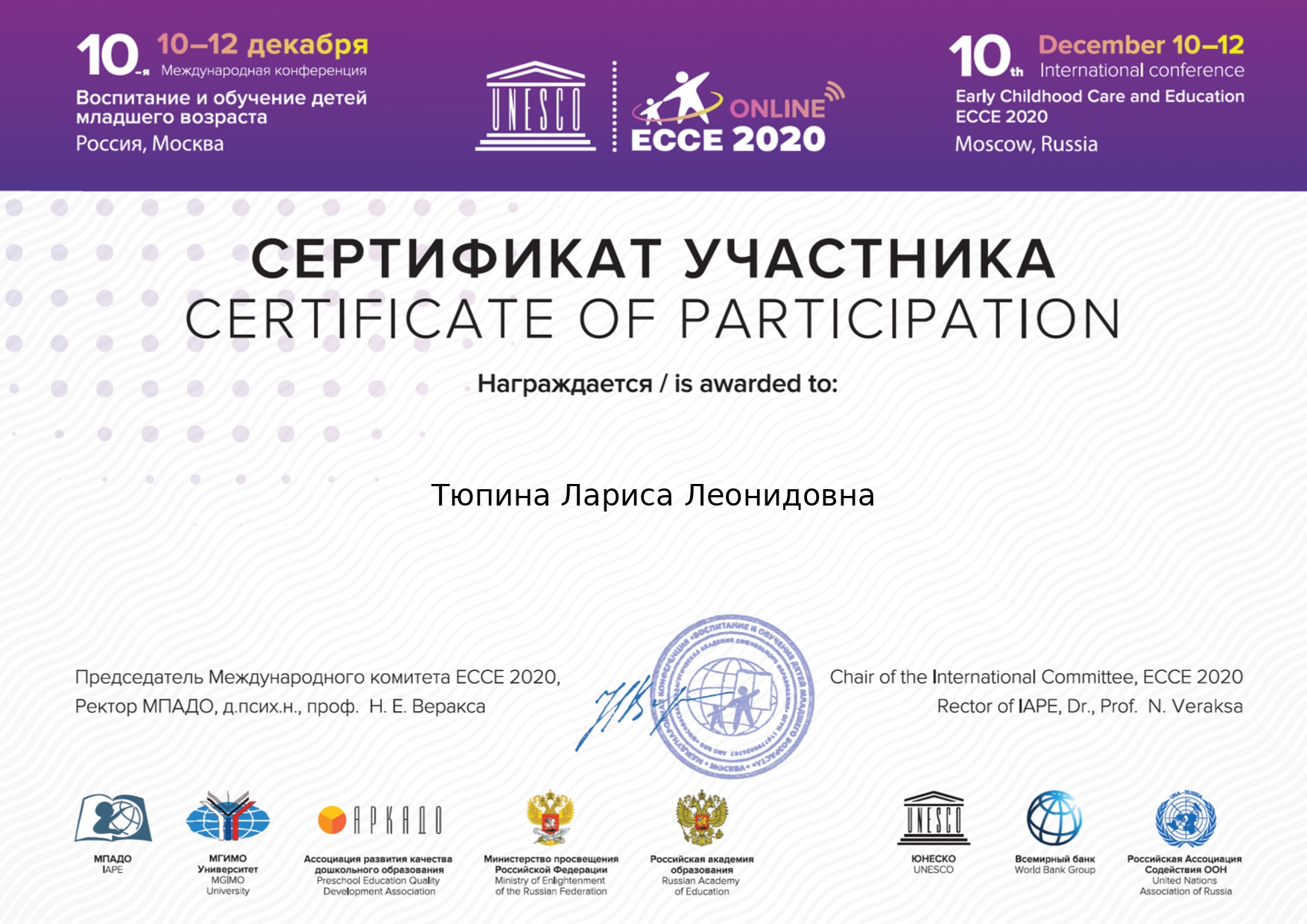 Сертификат участника международной конференции "Воспитание и обучение детей младшего возраста" Россия, Москва, 10-12 декабря 2020 г.
