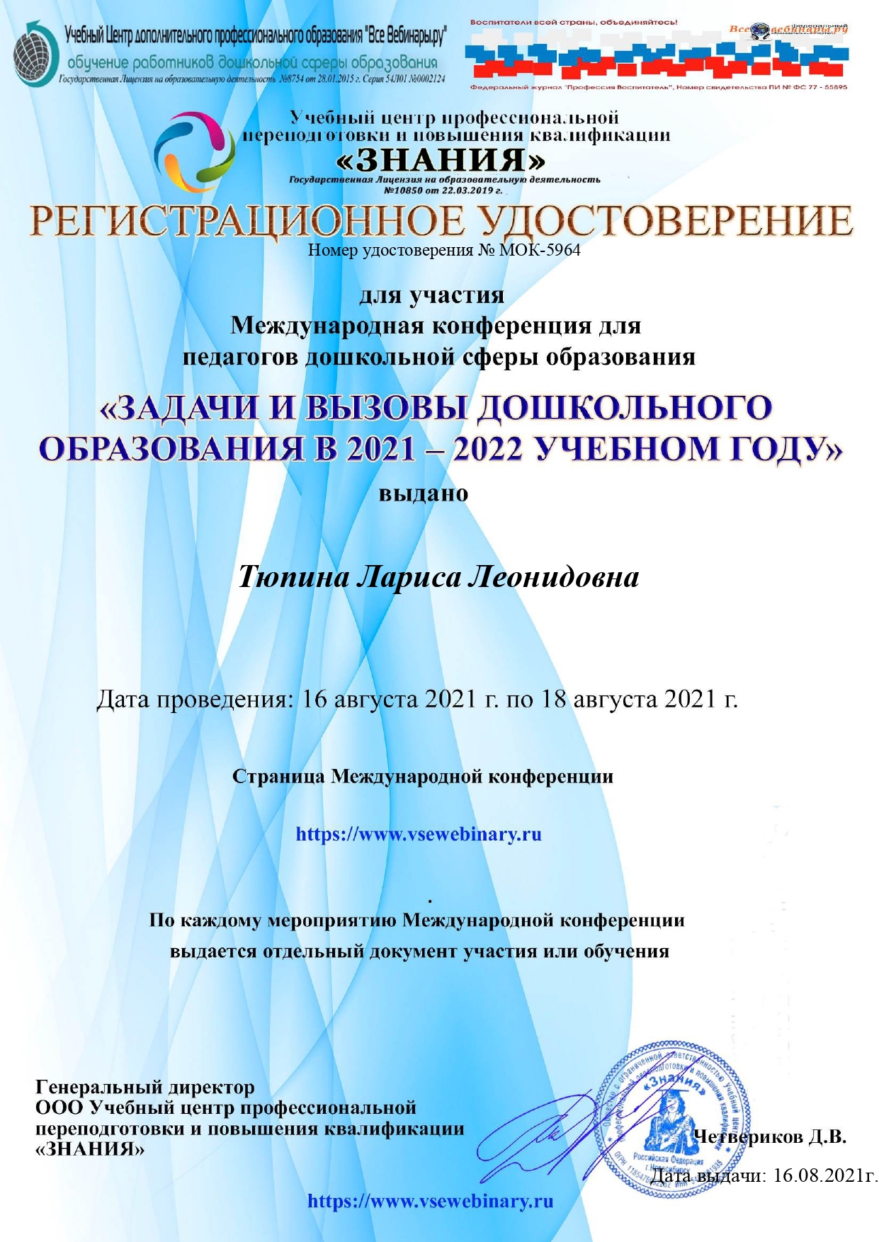 Удостоверение участника международной конференции для педагогов дошкольной сферы образования "Задачи и вызовы дошкольного образования в 2021 - 2022 учебном году", 16 - 18 августа 2021 г.
