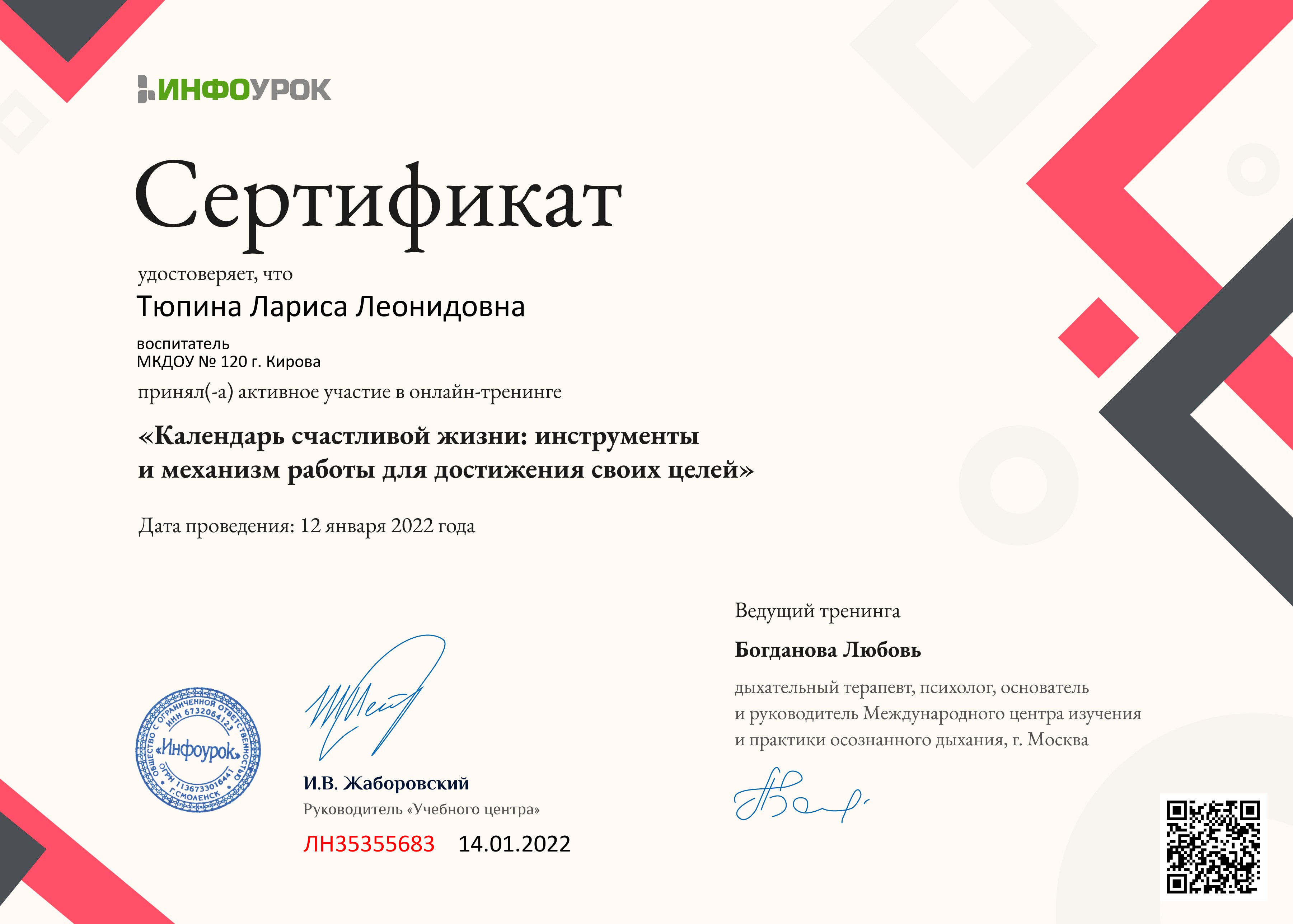Сертификат участника онлайн-тренинга "Календарь счастливой жизни: инструменты и механизм работы для достижения своих целей"