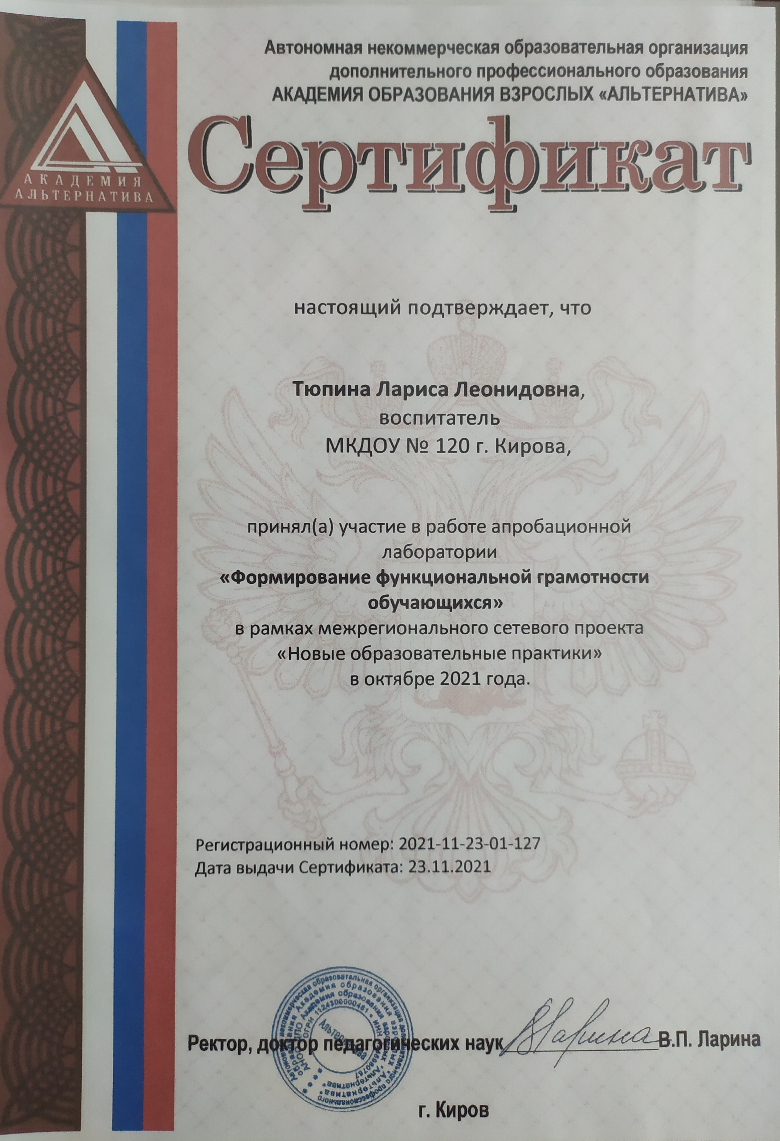 Сертификат участника апробационной лаборатории "Формирование функциональной грамотности обучающихся" в рамках межрегионального сетевого проекта "Новые образовательные практики" в октябре 2021 года. 23.11.2021 г.