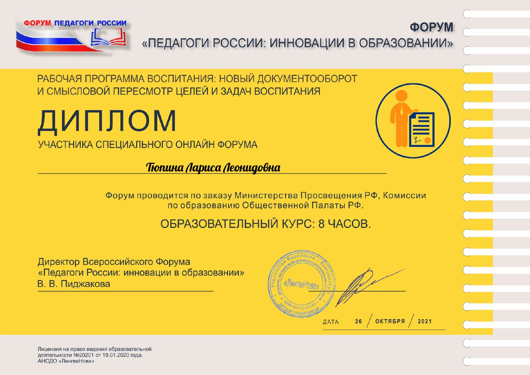 Диплом участника специального онлайн форума "Рабочая программа воспитания: новый документооборот и смысловой пересмотр целей и задач воспитания", 26.10.2021