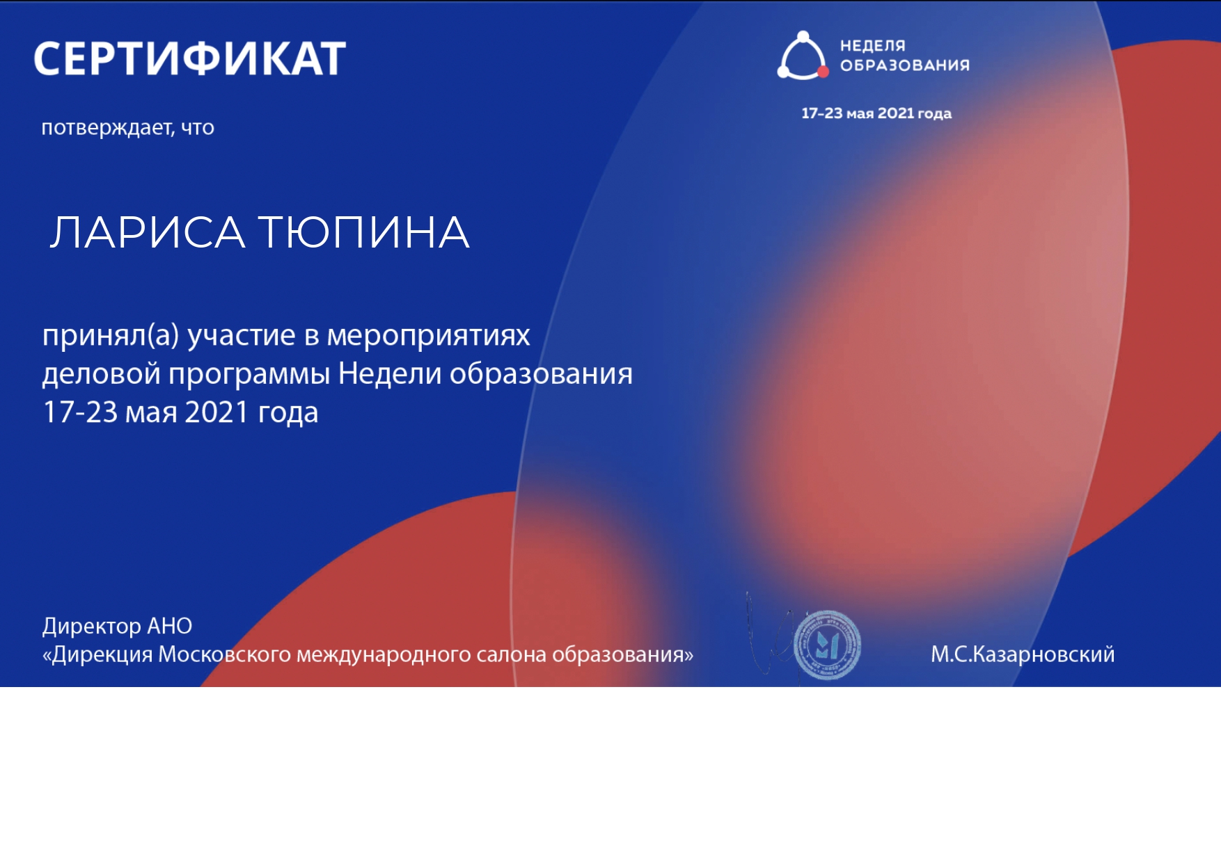 Сертификат участника деловой программы Недели образования 17-23 мая 2021 года