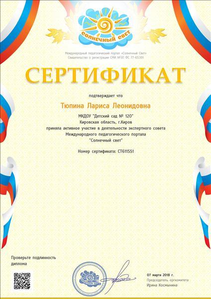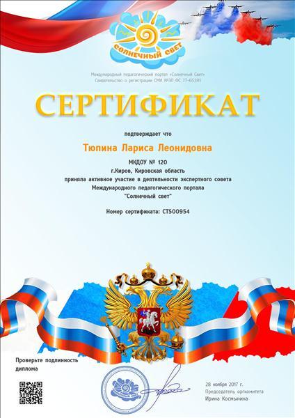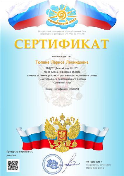 Сертификат подтверждает что приняла активное участие в деятельности экспертного совета Международного педагогического портала "Солнечный свет"