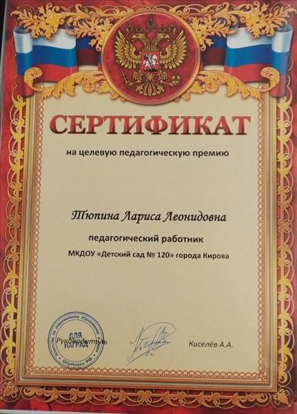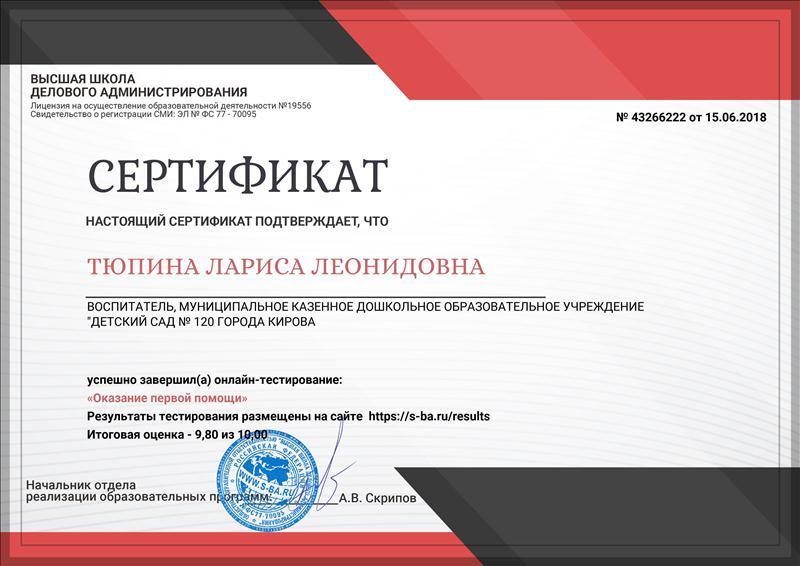 Сертификат об успешном завершении онлайн-тестирования "Тест для квалификационного испытания воспитателя дошкольного учреждения"