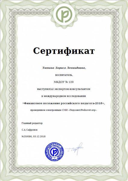 Сертификат , выступила экспертом-консультантом в международном исследовании "Финансовое положение российского педагога-2018"