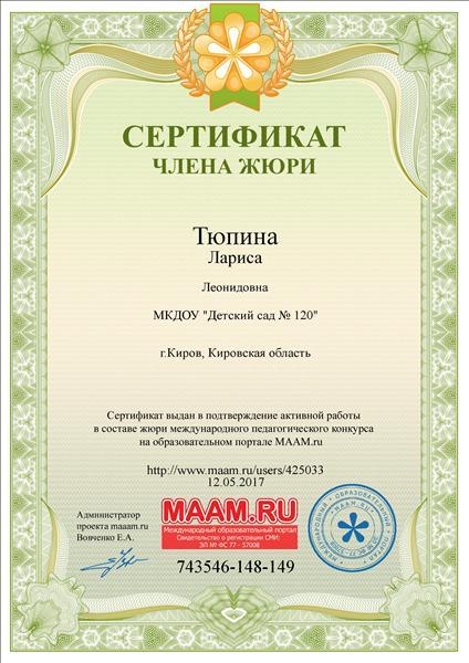 Сертификат члена жюри международного педагогического конкурса на образовательном портале МААМ.ru