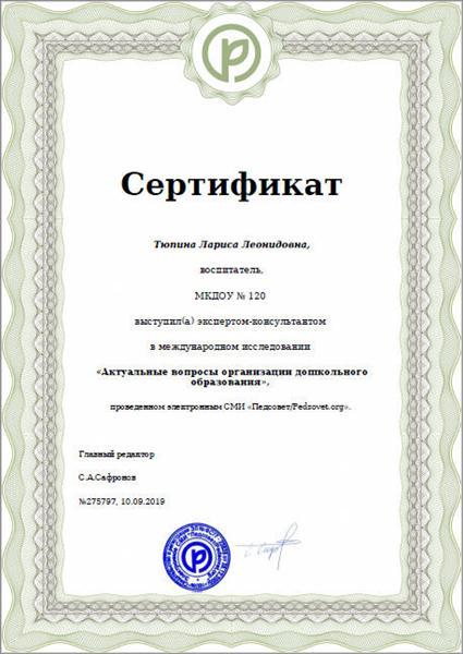 Сертификат эксперта-консультанта в международном исследовании "Актуальные вопросы организации дошкольного образования"