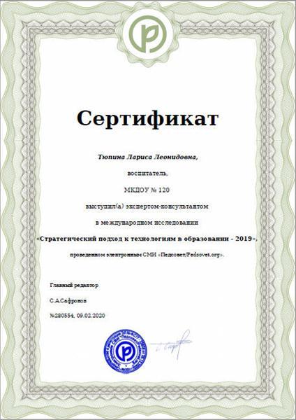 Сертификат эксперта-консультанта в международном исследовании "Стратегический подход к технологиям в образовании - 2019"