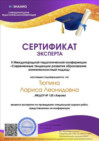 Сертификат эксперта II Международной педагогической конференции "Современные тенденции развития образования: компетентностный подход" настоящим подтверждает, что является экспертом по проведению специальной оценки работ, представленных на конференции.
