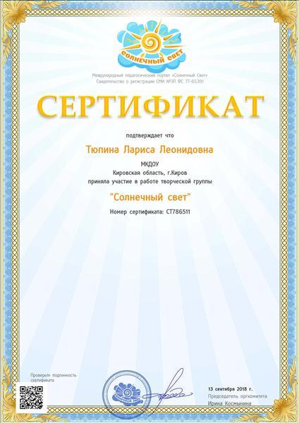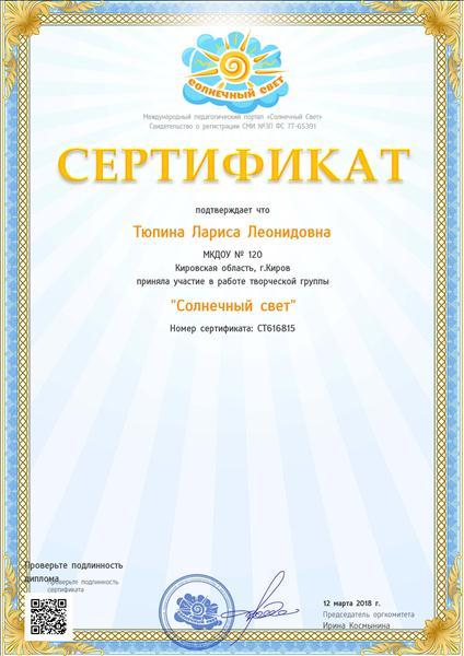 Сертификат подтверждает что приняла участие в работе творческой группы "Солнечный свет"